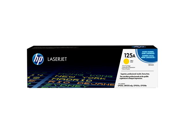 Produktbeskrivning HP 125A - gul - original - LaserJet - tonerkassett (CB542A) Typ av produkt Tonerkassett Utskriftsteknik Laser HP-submärke LaserJet Utskriftsfärg Gul Egenskaper för tonerkassett HP ColorSphere/Smart utskrift Avkastning Upp till 1400 sidor ISO/IEC 19798 Återvunnet produktinnehåll 17 % Kompatibel med Color LaserJet CM1312 MFP, CP1215, CP1217, CP1515n, CP1518ni -