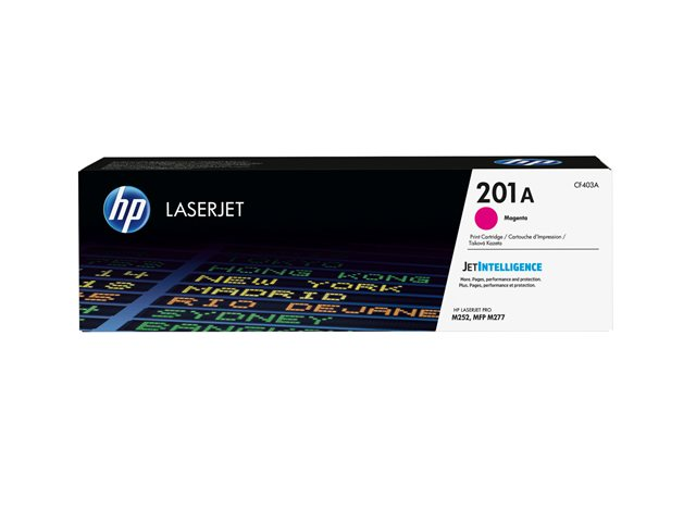 Produktbeskrivning HP 201A - magenta - original - LaserJet - tonerkassett (CF403A) Typ av produkt Tonerkassett Utskriftsteknik Laser HP-submärke LaserJet Utskriftsfärg Magenta Avkastning Upp till 1400 sidor ISO/IEC 19798 Kompatibel med Color LaserJet Pro M252dn, M252dw, M252n, MFP M277c6, MFP M277dw, MFP M277n -