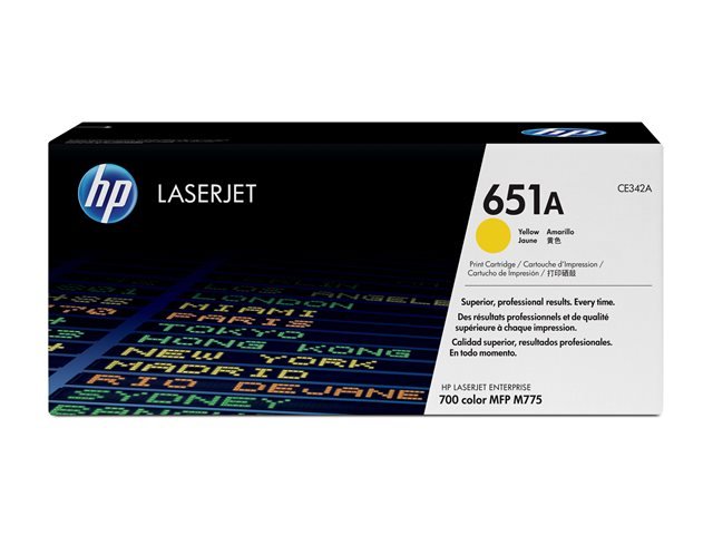 Produktbeskrivning HP 651A - gul - original - LaserJet - tonerkassett (CE342A) Typ av produkt Tonerkassett Utskriftsteknik Laser HP-submärke LaserJet Utskriftsfärg Gul Avkastning Upp till 16000 sidor ISO/IEC 19798 Kompatibel med Color LaserJet Enterprise MFP M775dn, MFP M775f, MFP M775z, MFP M775z+; LaserJet Managed MFP M775fm, MFP M775zm -