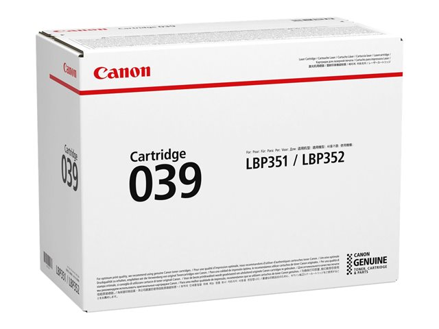 Produktbeskrivning Canon 039 - svart - original - tonerkassett Typ av produkt Tonerkassett Utskriftsteknik Laser Utskriftsfärg Svart Avkastning Upp till 11000 sidor Kompatibel med imageCLASS LBP351dn, LBP351x, LBP352dn, LBP352x; i-SENSYS LBP351x, LBP352x; Satera LBP351i -