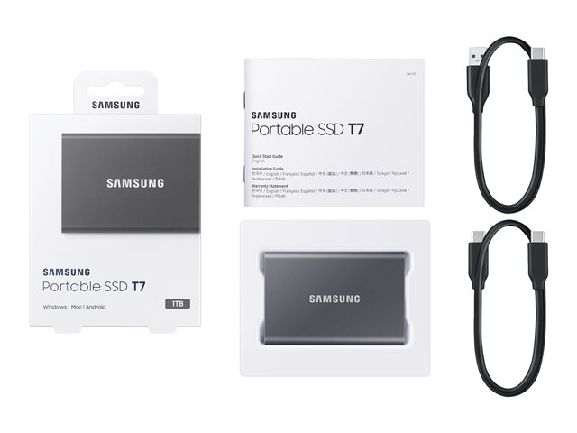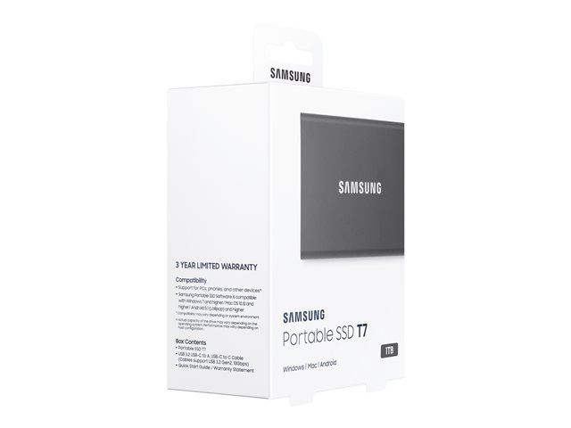 Produktbeskrivning Samsung T7 MU-PC1T0T - SSD - 1 TB - USB 3.2 Gen 2 Typ SSD-enhet - extern (portabel) Kapacitet 1 TB Maskinvarukryptering Ja Krypteringsalgoritm 256 bitars AES Gränssnitt USB 3.2 Gen 2 - USB-C Dataöverföringshastighet 10,0 GB (USB 3.2 Gen2) Egenskaper Dynamic Thermal Guard protection, stöttålig, validering av lösenord, NVM Express (NVMe), 256 bitars AES Strömkälla USB-buss Färg Titan gray Dimensioner (BxDxH) 85 mm x 8 mm x 57 mm Vikt 58 g Tillverkarens garanti 3 års garanti -