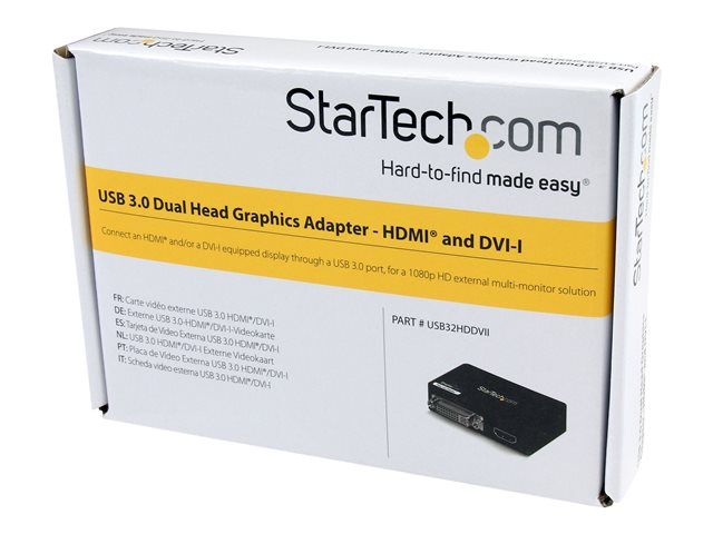 Produktbeskrivning StarTech.com USB 3.0 till HDMI / DVI-adapter - 2048x1152 - videokort - HDMI / USB - TAA-kompatibel Kabel Videokort - HDMI / USB TAA-kompatibel Ja Max effektupplösning 2048 x 1152 - 60 Hz Färg Svart Kontakter USB Type B - hona Kontakter (andra änden) HDMI - hona