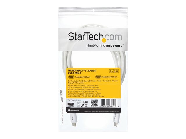 Produktbeskrivning StarTech.com 6.6ft (2m) Thunderbolt 3 Cable, 20Gbps, 100W PD, 4K Video, Thunderbolt-Certified, Compatible w/ TB4/USB 3.2/DisplayPort - Thunderbolt-kabel - USB-C till USB-C - 2 m Typ Thunderbolt-kabel Egenskaper Stöd för 4K Kabellängd 2 m Kontaktdon 24 pin USB-C - hane Kontakt (andra änden) 24 pin USB-C - hane Standarder som följs USB 3.1 Gen 2 / Thunderbolt 3 / DisplayPort 1.2 Färg Vit Tillverkarens garanti 2 års garanti Designat för P/N: CDP2HDUACP, CDP2HDUACPW -