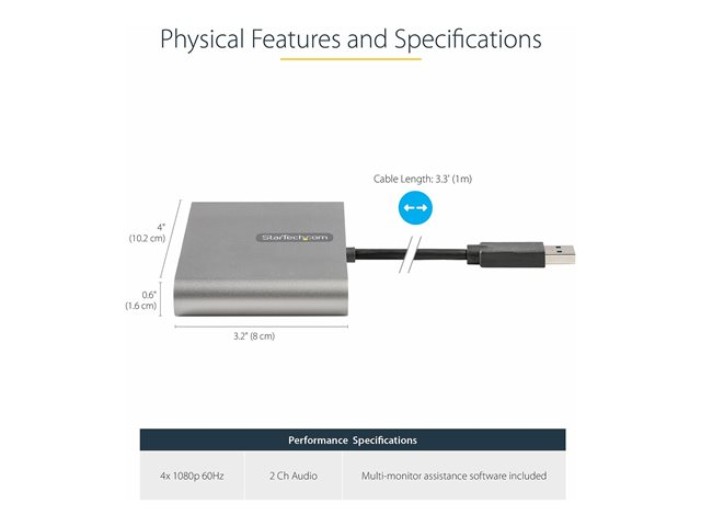 Externa video- och grafikkort - USB Type-A till dongel för Quad HDMI-skärmadapter - 1080p 60 Hz - USB A till HDMI-konverterare för flera skärmar - Endast Windows - Adapterkabel - USB typ A hane till HDMI hona - 1 m - rymdgrå - 1080p stöd 60 Hz
