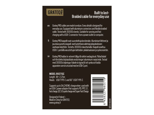 Produktbeskrivning GRATEQ PRO - USB typ C-kabel - 24 pin USB-C till 24 pin USB-C - 2.25 m Typ USB typ C-kabel Egenskaper USB-strömförsörjning (240W), synkronisering och laddning, skärmad, Quick Charge 3.0, stöd för snabbladdning, programmerbar strömförsörjning (PPS), stöd för supersnabb laddning, tål 30 000 böjar, aluminiumkontakter Längd 2.25 m Kontaktdon 24 pin USB-C - hane Kontakt (andra änden) 24 pin USB-C - hane - vinklad 90 grader Märkström 5 A Färg Vit -