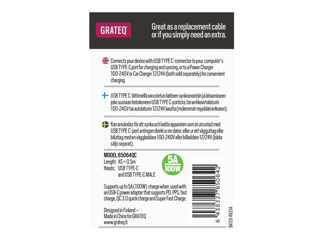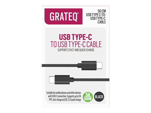 Produktbeskrivning GRATEQ - USB typ C-kabel - 24 pin USB-C till 24 pin USB-C - 50 cm Typ USB typ C-kabel Egenskaper USB-strömförsörjning (100W), strömförsörjningsteknologi, Quick Charge 3.0, stöd för snabbladdning, programmerbar strömförsörjning (PPS), stöd för supersnabb laddning Kabellängd 50 cm Kontaktdon 24 pin USB-C - hane Kontakt (andra änden) 24 pin USB-C - hane Märkspänning Ac 100- 240 V Märkström 5 A Färg Svart -