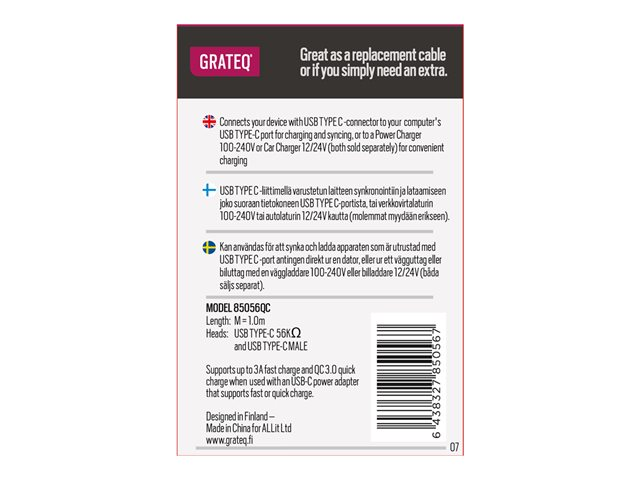 Produktbeskrivning GRATEQ - USB typ C-kabel - 24 pin USB-C till 24 pin USB-C - 1 m Typ USB typ C-kabel Egenskaper USB-strömförsörjning (100W), Quick Charge 3.0, stöd för snabbladdning Kabellängd 1 m Kontaktdon 24 pin USB-C - hane Kontakt (andra änden) 24 pin USB-C - hane Märkström 5 A Färg Vit Tillverkarens garanti 6 månaders garanti -