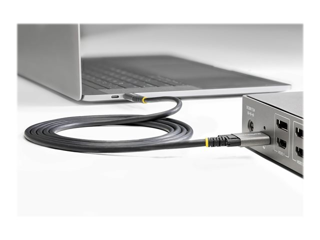 Produktbeskrivning StarTech.com 50 cm sidoskruvlåsande USB C-kabel 10 Gbit/s - USB 3.1/3.2 Gen 2 Type-C kabel - 100W (5A) Power Delivery-laddning, DP alt-läge - Dubbel skruvlåsning - USB-C-kabel ladda/synkronisera - USB typ C-kabel - USB-C till USB-C - 50 cm Typ USB typ C-kabel Egenskaper Stöd för 4K, EMI-skydd, stödjer DisplayPort alternativläges, strömförsörjningsteknologi, ytterdiameter 4,8 mm, 10 Gb datahastighet Kabellängd 50 cm Kontaktdon 24 pin USB-C - hane - rakt/lockande Kontakt (andra änden) 24 pin USB-C - hane - rak Standarder som följs USB 3.2 Gen 2 / DisplayPort 1.4 /Thunderbolt 3 Färg Grå, svart Tillverkarens garanti 2 års garanti -