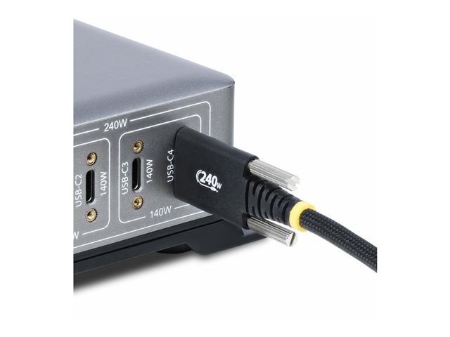 Produktbeskrivning StarTech.com 6.6ft (2m) USB-C Charging Cable, 240W, Silicone Jacket - USB typ C-kabel - USB-C till USB-C - 2 m Typ USB typ C-kabel Teknik Skärmad Egenskaper Utökat effektområde (EPR), USB-strömförsörjning (240W), Stöd för Power Delivery 3,1, synkronisering och laddning, EMI-skydd, halogenfri, e-markörchip, ABS-kopplingshus, 480 Mbit/s datahastighet, slitstark, robust, stöd för snabbladdning, klarar mer än 20.000 böjningar Kabellängd 2 m Kontaktdon 24 pin USB-C - hane - rakt/lockande Kontakt (andra änden) 24 pin USB-C - hane - rak Märkspänning 48 V Märkström 5 A Standarder som följs USB / USB 2.0 Färg Svart Tillverkarens garanti Begränsad livstidsgaranti -
