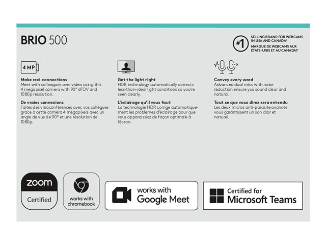 Produktbeskrivning Logitech BRIO 500 - webbkamera Typ av enhet Webbkamera Ljud Ja: dubbla inbyggda stereomikrofoner Kameramonteringstyp Stativmontering Dimensioner (BxDxH) 11 cm x 3.15 cm x 3.15 cm Färg Grafit Anslutningsteknik Kabelanslutning Kamera Färg Max upplösning 1920 x 1080 Bildhastighet (max) 60 frames per second Videoformat 1080p, 720p Fokuseringsjustering Automatisk Gränssnitt USB-C Mjukvarucertifiering Certifierad för Microsoft-teams, Optimerat för Google Meet, Zoomcertifierad Medföljande kablar 1 - USB-C-kabel - 1.5 m Egenskaper RightLight 4-teknik, RightSight-teknik, automatisk ljuskorrigering, automatisk bildfrekvens, Visningsläge, sekretesslutare, High Dynamic Range (HDR), noise reduction, Live Image Control Tillverkarens garanti 1 års garanti Fungerar med Chromebook Ja -
