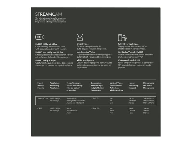Produktbeskrivning Logitech StreamCam - livestreamingkamera Typ av enhet Livestreamingkamera Ljud Ja: inbyggda dubbla riktiga mikrofoner Dimensioner (BxDxH) 5.8 cm x 4.8 cm x 6.6 cm Vikt 150 g Färg Vit Anslutningsteknik Kabelanslutning Kamera Färg Max upplösning 1920 x 1080 Bildhastighet (max) 60 frames per second Videoformat 1080p Brännvidd 3.7 mm Fokuseringsjustering Automatisk (minimiavstånd 10 cm) Iris-lins F/2.0 Gränssnitt USB-C 3.1 Gen 1 Medföljande kablar 1 - USB-C 3.1-kabel - integrerad - 1.5 m Egenskaper Automatisk exponeringskontroll, LED-indikator, noise reduction, elektronisk bildstabilisering Tillverkarens garanti 1 års garanti -