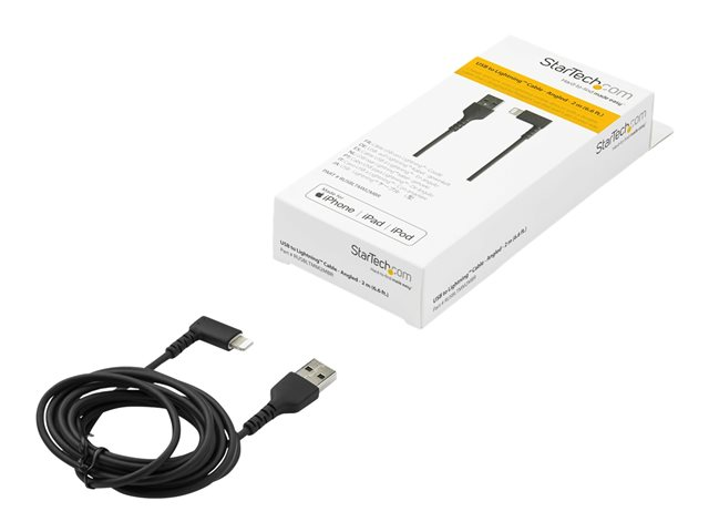 Produktbeskrivning StarTech.com 2m tålig USB-A till Blixtkabel - svart 90° högervinkad, robust aramidfiber USB typ A till Blixtuppladdning/synkron sladd - Apple MFi-certifierad - iPhone - Lightning-kabel - Lightning / USB - 2 m Kabel Lightning-kabel - Lightning / USB Teknik Dubbelt skärmad Kabellängd 2 m Färg Svart Kontaktdon Lightning - hane - vinklad Kontakt (andra änden) USB - hane Egenskaper Synkronisering och laddning, klammer Tillverkarens garanti 2 års garanti -