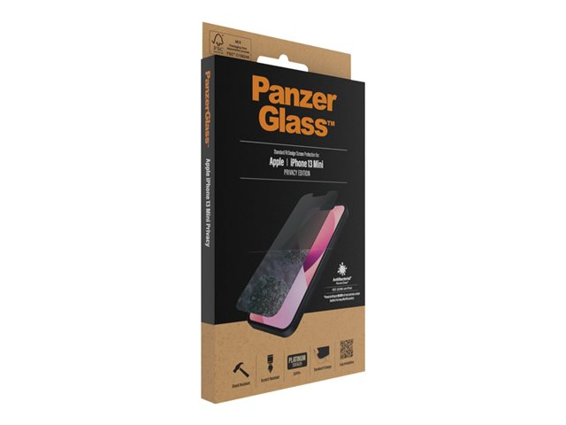 Produktbeskrivning PanzerGlass - skärmskydd för mobiltelefon Typ av produkt Skärmskydd - glas - med sekretessfilter Avsedd för Mobiltelefon Skydd Reptålig, antibakteriell, stötsäkert Beläggning Antimikrobiell Produktmaterial Härdat glas Tillverkarens garanti 30-dagars retur Designat för Apple iPhone 13 mini -