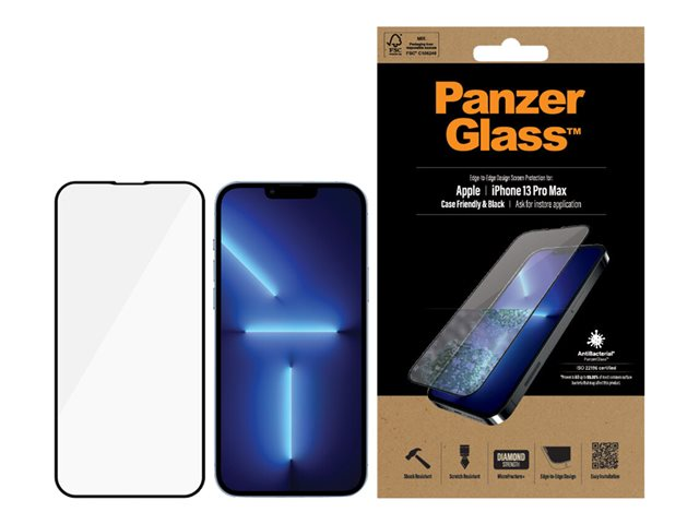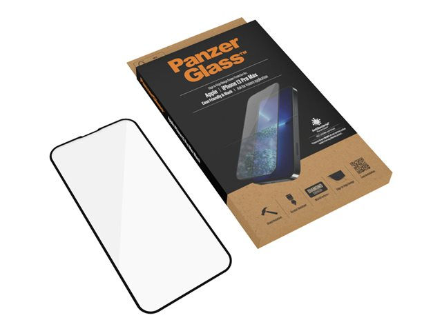 Produktbeskrivning PanzerGlass - skärmskydd för mobiltelefon Typ av produkt Skärmskydd - glas Avsedd för Mobiltelefon Skydd Antibakteriell, stötsäkert, reptålig, fingeravtrycksresistent Beläggning Oleofob Produktmaterial Härdat glas Dimensioner (BxDxH) 7.445 cm x 15.7312 cm Grovlek 0.61 mm Vikt 23 g Ramfärg Svart Designat för Apple iPhone 13 Pro Max -