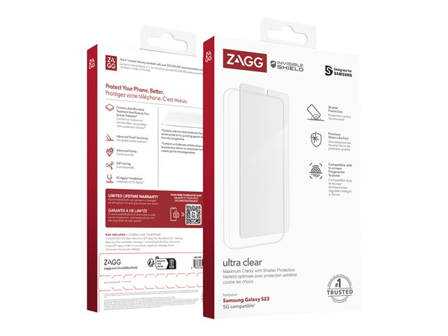 Produktbeskrivning ZAGG InvisibleShield Ultra Clear - skärmskydd för mobiltelefon Typ av produkt Skärmskydd Avsedd för Mobiltelefon Skydd Okrossbar, antimikrobisk, droppskydd, repskydd Beläggning Antimikrobiell Förpacknings innehåll Skärmskydd, avtorkare, rengöringstrasa, dammborttagningsmärke, EZ Apply-fack, mikrofiberduk Tillverkarens garanti Begränsad livstidsgaranti Designat för Samsung Galaxy S23 -