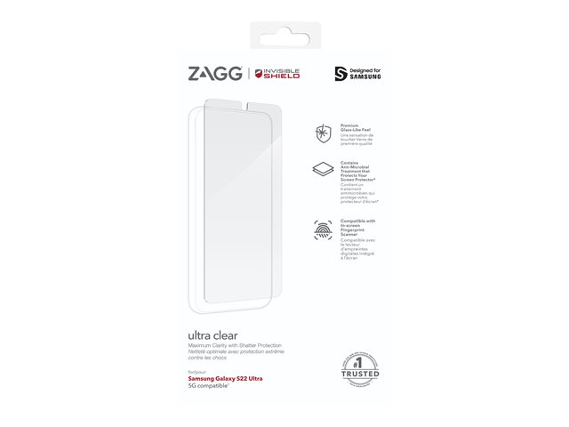 Produktbeskrivning ZAGG InvisibleShield Ultra Clear+ - skärmskydd för mobiltelefon - självreparerande Typ av produkt Skärmskydd Avsedd för Mobiltelefon Skydd Antimikrobisk, droppskydd, repskydd Förpacknings innehåll Skärmskydd, EZ Apply-flikar Designat för Samsung Galaxy S22 Ultra -