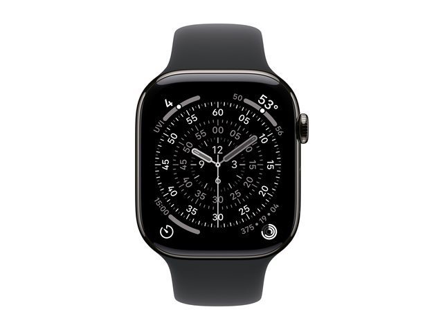 Produktbeskrivning Apple Watch Series 11 (GPS + Cellular) - skiffer titan - smart klocka med sportband - svart - 64 GB Produkttyp Smart klocka Tillverkarens modellnummer A3337 Aktivitet/sport Golf, löpning, simning, skidor, cykling, vandring, promenader, yoga, snowboarding, strength training, elliptisk, multisport, dans, trappgång, pilates, rullstol, intervallträning med hög intensitet (HIIT), utomhusrodd, paddling, roddmaskin, nedkylning, kernträning, tai chi, kickboxning Spårningsdata Distans, tid, brända kalorier, aktivitet, sovaktivitet, hjärtfrekvens, blodsyremättnad, sömnstadier, löptakt, ljudnivå, menstruell cykel, mätvärden för simning, ECG, träningslast, sömnkvalitetspoäng, ägglossningsfasen, steglängd, medvetenhet Anslutning LTE, Wi-Fi 4, UWB, Bluetooth 5G Navigering GPS/GLONASS/Galileo/BeiDou/QZSS-mottagare Bildskärm Retina LTPO3 OLED 416 x 496 pixlar - 326 ppi - safirglass - always-on display Processor Apple S10 Lagring 64 GB Operativsystem WatchOS Boett Rektangulär - 46 mm - 100% återvunnen titan Band Svart - sportband - fluoroelastomer - storlek: M/L - utbytbar Betalningsteknik Apple Pay Intelligent assistent Siri Inmatning Pekskärm, sidoknapp, roterande krona, dubbeltryck, handledsvridningsgest Passar handled med omkrets 160-210 mm Aviseringar Kalender, SMS, E-post, appar, hög och låg hjärtfrekvens, oregelbunden rytm, sömnapné-notifikationer, backtrack, hypertoni Funktioner Samtalshantering, Falldetektering, Nödläge SOS, medicinpåminnelse, sömnapnédetektering, hjärtfrekvenszoner, ljusstyrka: 2 000 nits, Stöd för familjeuppstart, Internationella nödsamtal, Kraschdetektering, brusövervakning, snabbladdning, kör träningsbygge, offline-kartor, roaming stöd Värdenhets-OS som stöds iOS Batteri Laddningsbart litiumjon Batteridriftstid Upp till 24 timmar Dimensioner (BxDxH) 39 mm x 9.7 mm x 46 mm Vikt 43.1 g Specifik absorptionshastighet (SAR) 0.97 W/kg (head)