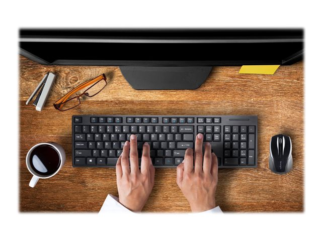 Produktbeskrivning Kensington Pro Fit Low-Profile Desktop Set - sats med tangentbord och mus - fransk - svart Inmatningsenhet Typ av enhet Sats med tangentbord och mus Gränssnitt 2.4 GHz Trådlös mottagare Trådlös USB-mottagare Anslutningsteknik Trådlös Lokalisering och layout Fransk Snabbtangentsfunktion Internetsökning, multimedia, e-post Skydd Spillsäker Numeriskt tangentbord Ja Pekenhet Mus - trådlös - optisk Antal knappar 3 Färg Svart Tillverkarens garanti 3 års garanti -