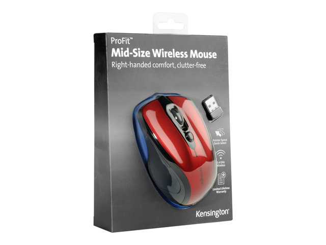 Produktbeskrivning Kensington Pro Fit Mid-Size - mus - 2.4 GHz - Rubinröd Typ av enhet Mus Anslutningsteknik Trådlös - 2.4 GHz Färg Rubinröd Inriktning Högerhänt Trådlös mottagare Trådlös USB-mottagare Teknik för rörelsedetektering Optisk Rörelseupplösning 1750 dpi Egenskaper Scrollhjul, Nano-trådlös mottagare Batteri 2 x AAA-typ Tillverkarens garanti 2 års garanti -