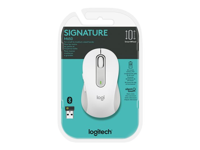 Produktbeskrivning Logitech Signature M650 - mus - 2.4 GHz, Bluetooth - offwhite Typ av enhet Mus Anslutningsteknik Trådlös - 2.4 GHz, Bluetooth Färg Offwhite Dimensioner (BxDxH) 6.18 cm x 10.719 cm x 3.78 cm Vikt 101.2 g Trådlös mottagare Logitech Logi Bolt USB-mottagare Teknik för rörelsedetektering Optisk Antal knappar 5 Rörelseupplösning 4000 dpi Prestanda Sensivitetsomkoppling i realtid 400 - 4 000 dpi Egenskaper SmartWheel, SilentTouch-teknik, sidohandtag i gummi, Logitech Advanced Optical Tracking Batteri AA-typ Operativsystem erfordras Windows 10 / 11 eller senare, Apple MacOS X 10.5 eller senare, Linux, Google Chrome OS, Apple iPadOS 13.4 eller senare, Android 5.0 or later Återvunnet produktinnehåll 26 % Fungerar med Chromebook Ja Tillverkarens garanti 1 års garanti -