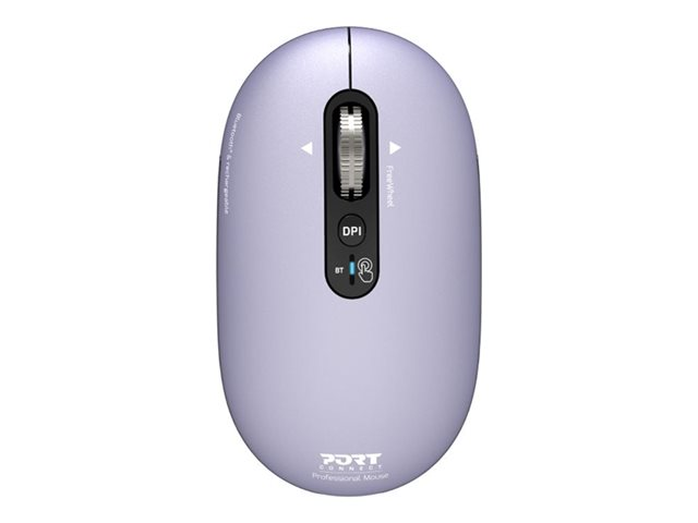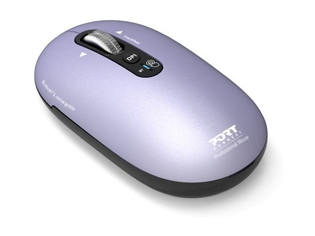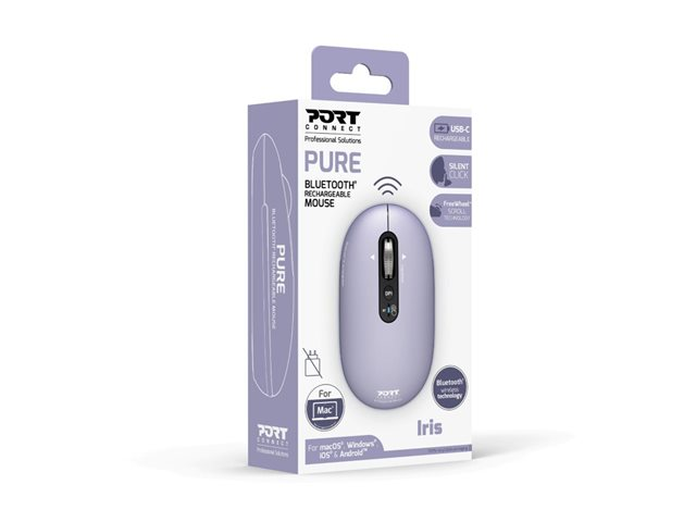 Produktbeskrivning PORT Connect PURE COLOR - mus - laddningsbar - Bluetooth - iris Typ av enhet Mus Anslutningsteknik Trådlös - Bluetooth Färg Iris Inriktning Höger- och vänsterhänta Dimensioner (BxDxH) 6.5 cm x 11 cm x 2.5 cm Vikt 85 g Teknik för rörelsedetektering Optisk Antal knappar 5 Rörelseupplösning 3200 dpi Prestanda Sensivitetsomkoppling i realtid 1000/1600/2400/3200 dpi Egenskaper Tyst klick, scrollhjul, FreeWheel-teknik, vänster och höger knappar Operativsystem erfordras Apple MacOS, Microsoft Windows, Apple iOS, Android Tillverkarens garanti 3 års garanti -