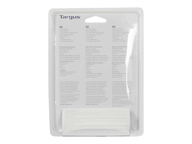 Produktbeskrivning Targus Multi Device Midsize Comfort - mus - antimikrobiell - 2.4 GHz, Bluetooth Typ av enhet Mus Anslutningsteknik Trådlös - 2.4 GHz, Bluetooth Rörelseupplösning 2400 dpi Prestanda Sensivitetsomkoppling i realtid 800/1 200/1 600/2 400 dpi Egenskaper Antimikrobiellt skydd Batteri AA-typ Operativsystem erfordras Microsoft Windows, Apple MacOS -
