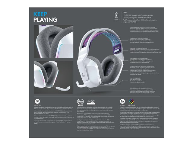 Produktbeskrivning Logitech G G733 LIGHTSPEED Wireless RGB Gaming Headset - headset Typ av produkt Headset - 2,4 GHz - trådlös Kompatibilitet Mac, Windows Rekommenderad användning Spelkonsol, dator Gaming Ja Färg Vit Hörlursmodell Fullstorlek Anslutningsteknik Trådlös Trådlös teknik 2,4 GHz radiofrekvens Ljudutgångsläge Stereo Ljudeffekter DTS Headphone:X 2.0 Ljudspecifikationer Frekvensrespons 20 - 20000 Hz - Sensitivitet 87.5 dB Impedans 39 ohm Mikrofon Bom Kontroller Stänga av ljud, volym, på/av Tillverkarens garanti 2 års garanti -