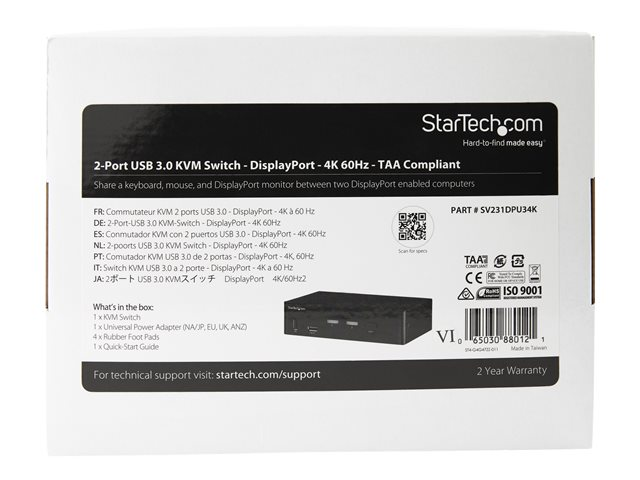 Produktbeskrivning StarTech.com DisplayPort KVM-switch med 4 portar - 4K 60 Hz - omkopplare för tangentbord/video/mus/ljud/USB - 2 portar - TAA-kompatibel Typ av enhet Omkopplare för tangentbord/video/mus/ljud/USB - 2 portar Undertyp KVM Portar 2 x KVM/ljud/USB Funktioner MST support, 4 K upplösningssupport Lokalisering Nordasien, Japan, Europa, Storbritannien, Australien, Nya Zeeland TAA-kompatibel Ja Tillverkarens garanti 2 års garanti -