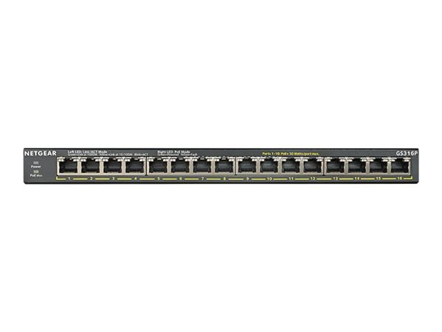 Produktbeskrivning NETGEAR GS316P - switch - 16 portar - ohanterad Typ av enhet Switch - 16 portar - ohanterad Undertyp Gigabit Ethernet Portar 16 x 10/100/1000 (PoE+) PoE (Power Over Ethernet) PoE+ PoE-budget 115 W Prestanda Icke-blockerande bandbredd: 32 Gbps