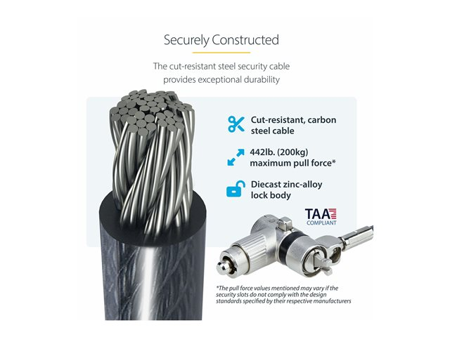 Produktbeskrivning StarTech.com 10-Pack Dual-Access Laptop Lock, 6.5ft (2m) Keyed Alike and Combination Security Cable Lock for K-Slot Devices, Computer Anti-Theft Steel Cable - lås för säkerhetskabel Produkttyp Lås för säkerhetskabel Förpackad kvantitet 10 (specificationerna gällerenskild post) Förpackningens innehåll 4 nycklar, 10 kardborreremmar, 10 säkerhetslås för laptops, 30 låsbrickor Färg Svart & silver Produktmaterial Plast, stål Dimensioner (BxDxH) 5.8 cm 3.1 cm Längd 2 m Vikt 176 g Egenskaper Stöldskydd, Kensington standarduttag (K-uttag) Tillverkarens garanti 2 års garanti -