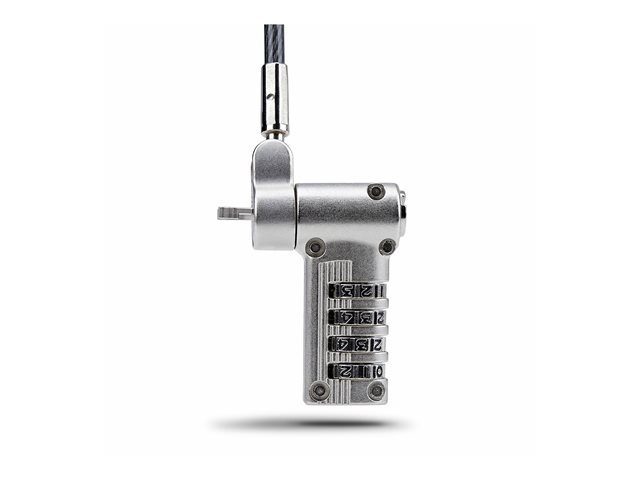 Produktbeskrivning StarTech.com Serialized Laptop Lock, Works w/Noble Wedge/Nano/K-Slot - lås för säkerhetskabel - universell - TAA-kompatibel Produkttyp Lås för säkerhetskabel - universell Förpackningens innehåll Fästrem med kardborre, 3 mellanlägg Färg Svart & silver Produktmaterial Plast, stål Dimensioner (BxDxH) 1.4 cm 4.6 cm Längd 2 m Vikt 146 g Egenskaper Stöldskydd, skärresistent, 360 graders rotation, Kensington Nano-uttag, Kensington standarduttag (K-uttag) TAA-kompatibel Ja Tillverkarens garanti 2 års garanti -