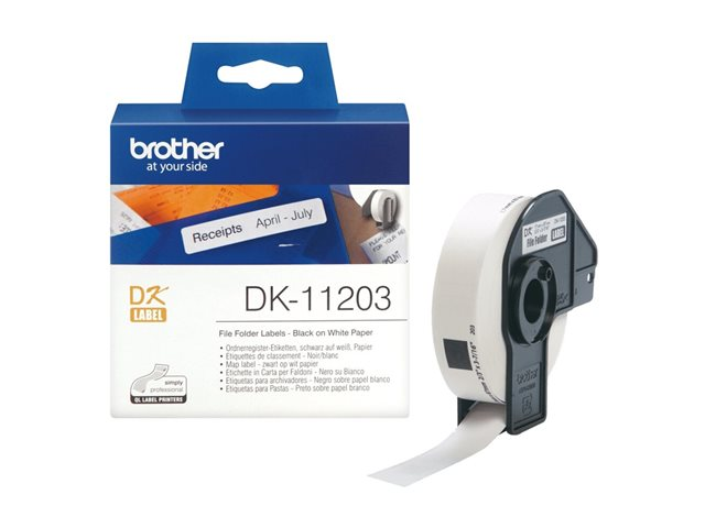 Produktbeskrivning Brother DK-11203 - etiketter för filmappar - 300 etikett (er) - 17 x 87 mm Typ av produkt Etiketter för filmappar Mediastorlek 17 x 87 mm Utskriftsteknik Direkttermo Mediefärger Svart på vitt Antal kort/etiketter per ark/rulle 300 Antal media med kort 1 rulle/rullar Medföljande antal 300 etikett (er) Kompatibel med Brother QL-1050 TypeA, QL-1050N, QL-500A, QL-500A (50TH Year Anniversary Model), QL-500BS, QL-500BW, QL-550, QL-560, QL-560VP, QL-570, QL-650TD, QL-710W, QL-710WSP, QL-720NW, QL-820NW -