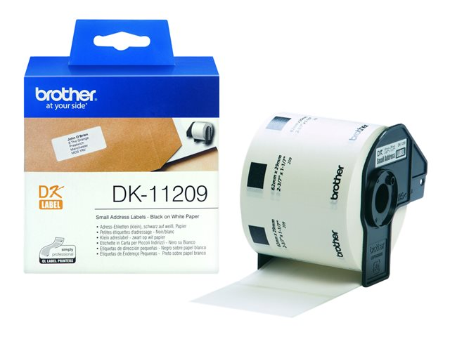Produktbeskrivning Brother DK-11209 - adresslappar Typ av produkt Adresslappar Utskriftsteknik Direkttermo Mediefärger Svart på vitt Antal kort/etiketter per ark/rulle 800 Kompatibel med Brother QL-1050 TypeA, QL-1050N, QL-500A, QL-500A (50TH Year Anniversary Model), QL-500BS, QL-500BW, QL-550, QL-560, QL-560VP, QL-570, QL-650TD, QL-710W, QL-710WSP, QL-720NW, QL-820NW -