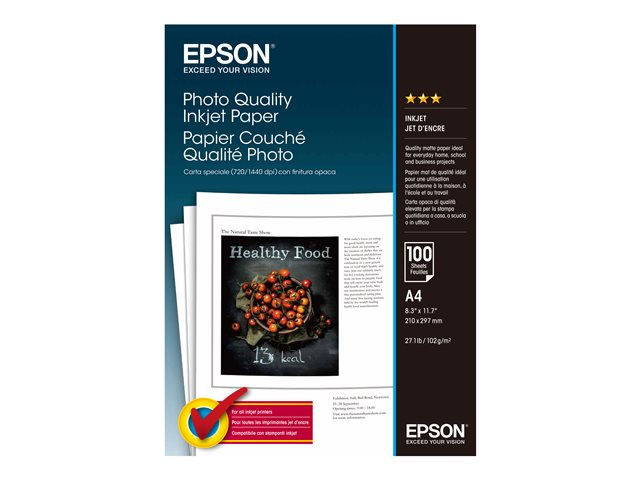 Produktbeskrivning Epson Photo Quality Ink Jet Paper - papper - matt - 100 ark - A4 - 102 g/m² Typ av produkt Papper Ytbeläggning Matt Beläggning Bestruket Mediastorlek A4 (210 x 297 mm) Utskriftsteknik Bläckstråle Medievikt 102 g/m² Mediefärger Kritvit Medföljande antal 100 ark Kompatibel med Epson L6190; EcoTank ET-1810, 2710, 2712, 2714, 2715, 2720, 2721, 2750, 2751, 2810, 2811, 2812, 2814, 2815, 2820, 2821, 2825, 2826, 2850, 2851, 2856, 4700, 4750, 4800, 4850, L14150, L6460, L6490; Expression Photo XP-970; SureColor SC-P700, P7500, P900, P9500, T2100, T3100, T3405, T5100, T5400, T5405 -