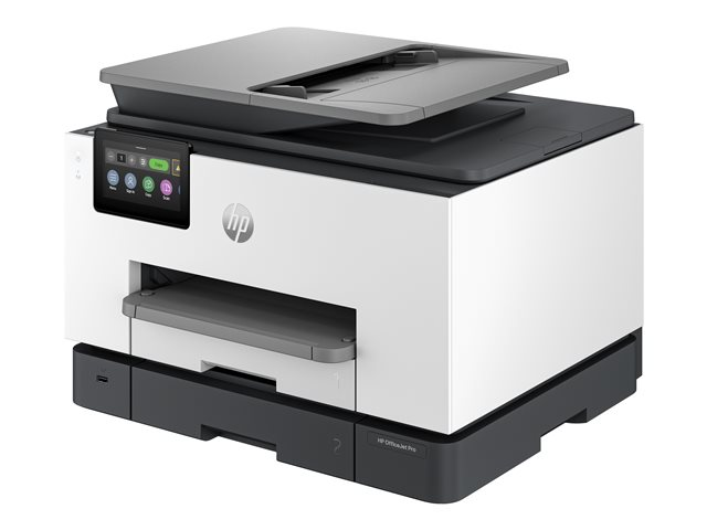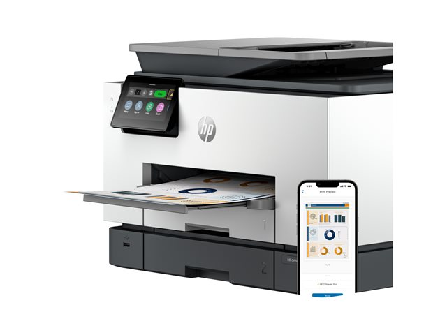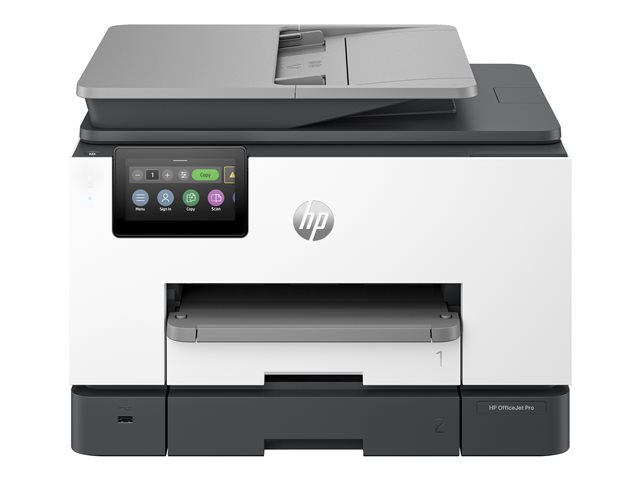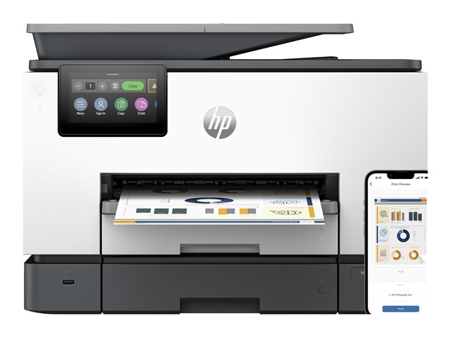 Produktbeskrivning HP Officejet Pro 9130b All-in-One - multifunktionsskrivare - färg Typ av enhet Multifunktionsskrivare Faxtyp Vanligt papper Lokalisering Västeuropa (utom Storbritannien, Irland, Litauen, Lettland) Utskriftsteknik Bläckstråle (färg) Bläckstråleteknik HP Thermal Inkjet - 4-färgs Driftscykel per månad (max) 30000 sidor Rekommenderad månatlig volym 2000 sidor Max kopieringshastighet Upp till 23 sidor/minut (mono)/upp till 15 sidor/minut (färg) Max kopieringsupplösning Upp till 600 dpi (mono)/upp till 600 dpi (färg) Max utskriftshastighet Upp till 25 sidor/minut (mono)/upp till 19 sidor/minut (färg) Max utskriftsupplösning Upp till 1200 x 1200 dpi (mono)/upp till 4800 x 1200 dpi (färg) Max faxöverföringshastighet 33.6 Kbps Faxupplösningar 300 x 300 dpi, 200 x 200 dpi, 200 x 100 dpi Skanning 1200 x 1200 dpi Display 4.3" Originalstorlek 127 x 127 mm (min) - Legal (216 x 356 mm) (max) Originaltyp Ark Dokumentmatarens kapacitet 35 ark Mediastorlek 76.2 x 127 mm (min) - Legal (216 x 356 mm), A4 (210 x 297 mm) (max) Mediatyp Vanligt papper, fotopapper, tjockt papper, kortlager, glansigt papper, matt papper Standard mediekapacitet 250 ark Max mediekapacitet 250 ark Utmatningsfackens kapacitet 100 ark Automatisk duplex Ja (kopiering) Ja (utskrift) Ja (skannar) Anslutningsmöjlighet Ja Gränssnitt USB 2.0, LAN, USB-värd, Wi-Fi(ac) AirPrint-aktiverad Ja Kontorsmaskinfunktioner Skriv ut från USB Flash-enhet, skanna till e-post, inbäddad webbläsare, Mopria-certifierad, skanna till SharePoint, HP Auto-On/Auto-Off Technology, HP Instant Ink, IPP-utskrift, skanna till nätverksmappen Strömtillförsel Växelström 120/230 V (50/60Hz) Dimensioner (BxDxH) 43.7 cm x 42.18 cm x 31.83 cm Vikt 11.84 kg Tillverkarens garanti 1 års garanti -