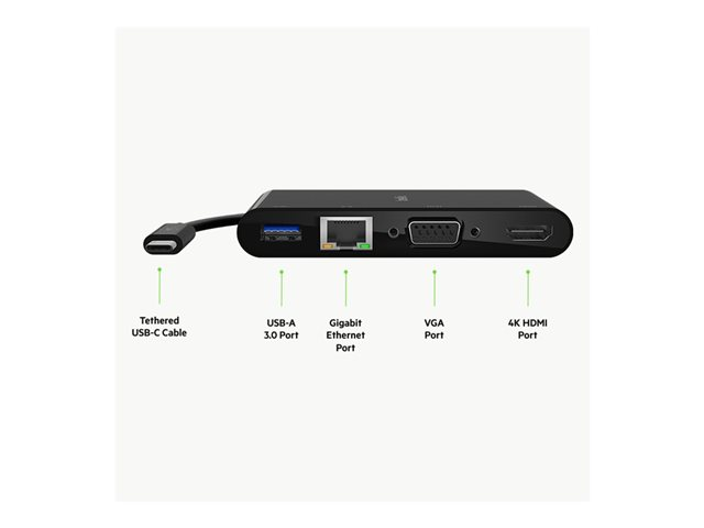 Produktbeskrivning Belkin flerportsadapter - USB-C - VGA, HDMI - 1GbE Typ av produkt Flerportsadapter Dockningsgränssnitt USB-C Videogränssnitt VGA, HDMI Dimensioner (BxDxH) 10.3 cm x 30.4 cm x 1.55 cm Nätverk Gigabit Ethernet Tillverkarens garanti 2 års garanti -