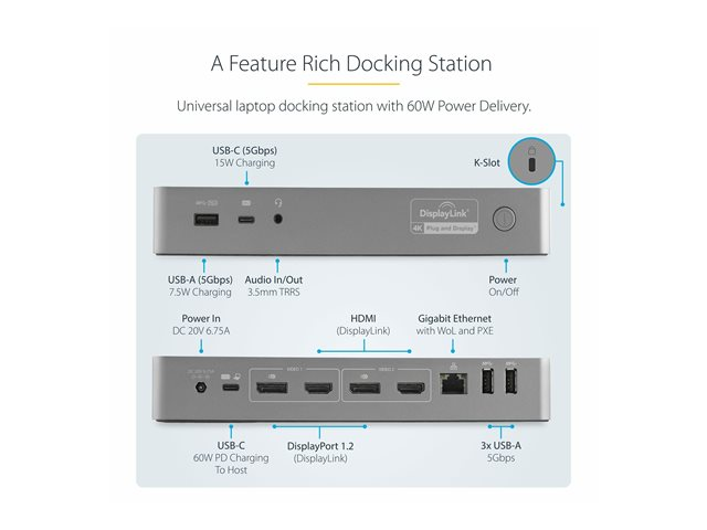 Produktbeskrivning StarTech.com USB-C- och USB-A-dockningsstation - hybrid universell dockningsstation för bärbar dator med dubbelskärm för 4K vid 60 Hz samt HDMI och DisplayPort - USB 3.1 Gen 1-hubb, GbE - strömförsörjning på 60 W - Windows, Mac och Chrome - dockningsstation - USB-C - 2 x HDMI, 2 x DP - 1GbE Typ av produkt Dockningsstation Dockningsgränssnitt USB-C Videogränssnitt 2 x HDMI, 2 x DP Dimensioner (BxDxH) 22 cm x 8 cm x 3 cm Vikt 280 g Färg Svart, rymdgrå Lokalisering Storbritannien, Europa Nätverk Gigabit Ethernet Strömtillförsel Strömadapter AC 120/230 V Tillverkarens garanti 3 års garanti -