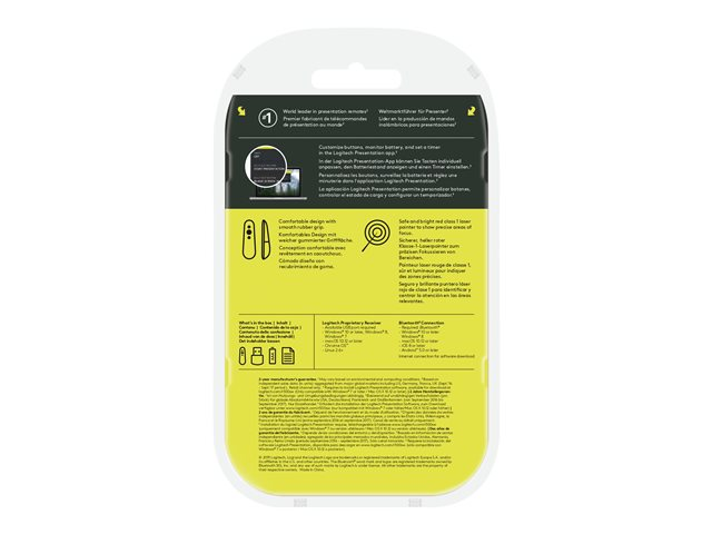 Produktbeskrivning Logitech R500s presentationsfjärrkontroll - grafit Typ av enhet Presentationsfjärrkontroll Färg Grafit Dimensioner (BxDxH) 3.66 cm x 2.47 cm x 12.36 cm Vikt 48.4 g Enheter som stöds PC Trådlös teknik Bluetooth 4.0 LE, 2.4 GHz Antal knappar 3 knappar Max arbetsavstånd 20 m Batteri 1 AAA-typ Tillverkarens garanti 2 års garanti -