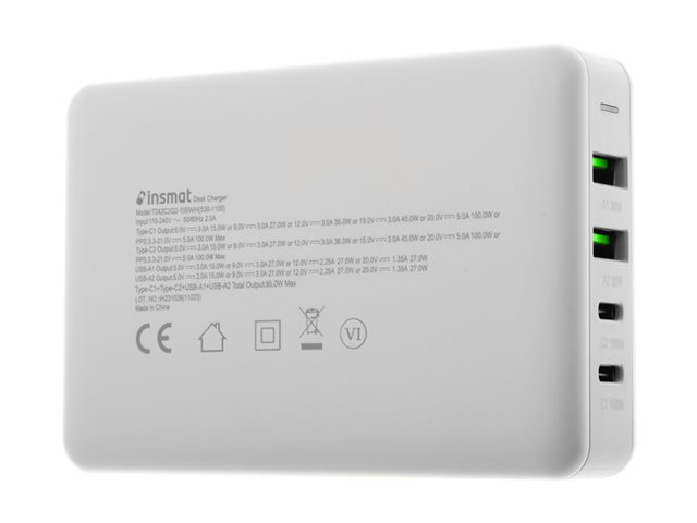 Produktbeskrivning Insmat strömadapter - GaN - 2 x 9-stifts USB typ A, 2 x USB-C - 100 Watt Typ av produkt Strömadapter Dimensioner (BxDxH) 10.3 cm x 2.9 cm x 7 cm Färg Vit Typ av utkontakt Total 4: 2 x 9-stifts USB typ A, 2 x USB-C Nätspänning AC 100-240 V Tillförd spänning 5 / 9 / 12 / 15 / 20 V Max elektrisk ström 5 A Snabbladdningsteknik Power Delivery 3.0, Qualcomm Quick Charge 3.0 Effekt 100 Watt Strömenhetsinformation 2 x - 24-stifts USB-C - utmatning - 20 V - 100 W - 5 A