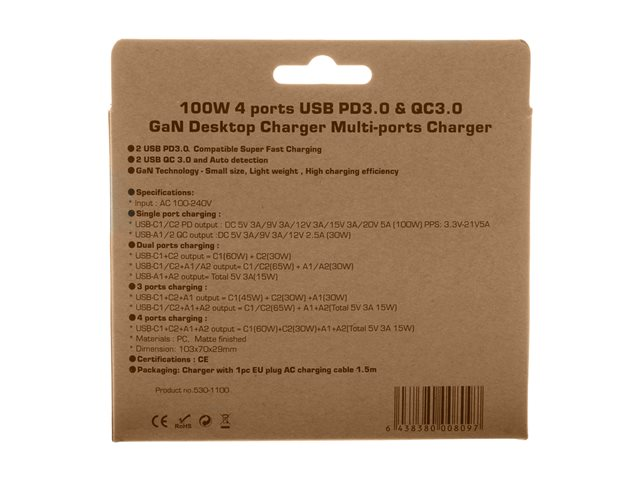 GaN - 100 Watt - 5 A - PD 3.0, QC 3.0 - 4 utdatakontakter (2 x 9-stifts USB typ A, 2 x USB-C) - vit