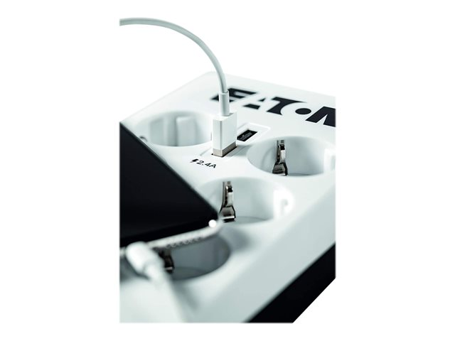 Produktbeskrivning Eaton Protection Box 6 USB Tel@ Din - överspänningsskydd - 2500 Watt Typ av enhet Överspänningsskydd - extern Vikt 646 g Inspänning Växelström 220-250 V Effektkapacitet 2500 Watt Inmatningsanslutningar 1 Utdatakontakter 6 x ström 2-polig