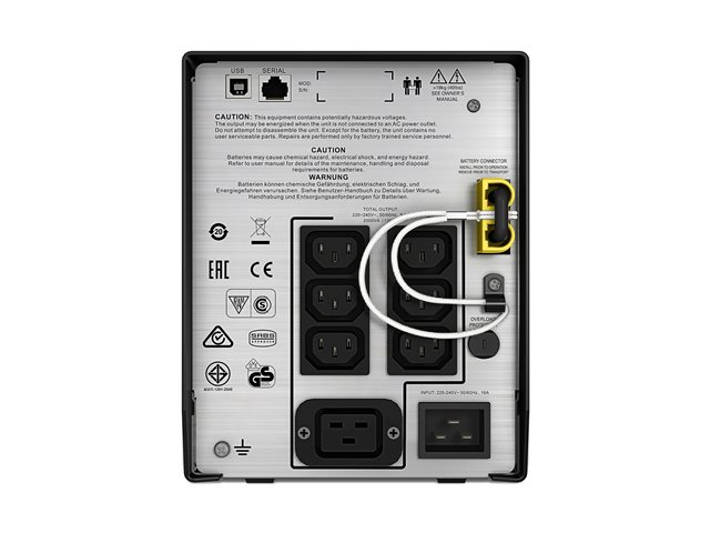 Produktbeskrivning APC Smart-UPS C 2000VA LCD - UPS - 1300 Watt - 2000 VA Typ av enhet UPS - extern Vikt 27.5 kg Inspänning AC 230 V Utspänning AC 230 V ± 5% Effektkapacitet 1300 Watt / 2000 VA Inmatningsanslutningar 1 x ström IEC 60320 C20 Utdatakontakter 6 x power IEC 60320 C13